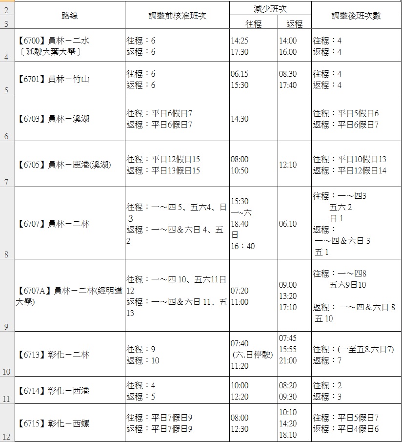 減班公告 疫情雖然趨緩 , 但因相關管制措施未完全解除 , 民眾搭乘意願仍低的影響之下 故本公司部分班次將於112/3/1起至112/3/31縮減 縮減班次如圖 另有班次調整時刻如下 6712西港-二林(返程)11:50→12:10 6703溪湖-員林(返程)06:20→06:10 造成不便請見諒 員林客運感謝您