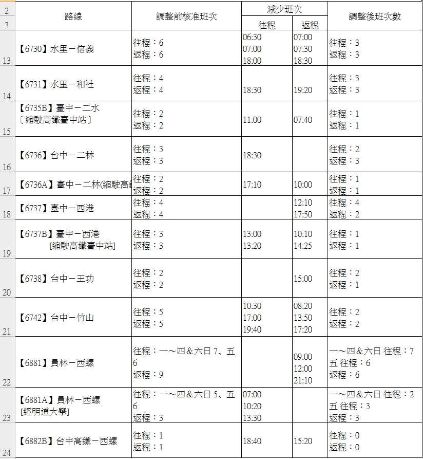 112年3月1日起 , 部分路線減班、調整時刻公告