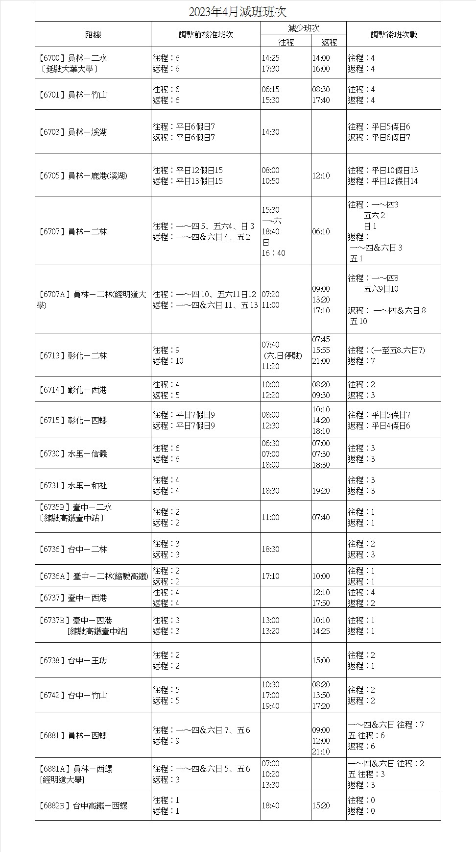 減班公告 疫情雖然趨緩 , 但因相關管制措施未完全解除 , 民眾搭乘意願仍低的影響之下 故本公司部分班次將於112/4/1起至112/4/30縮減 縮減班次如圖 造成不便請見諒 員林客運感謝您