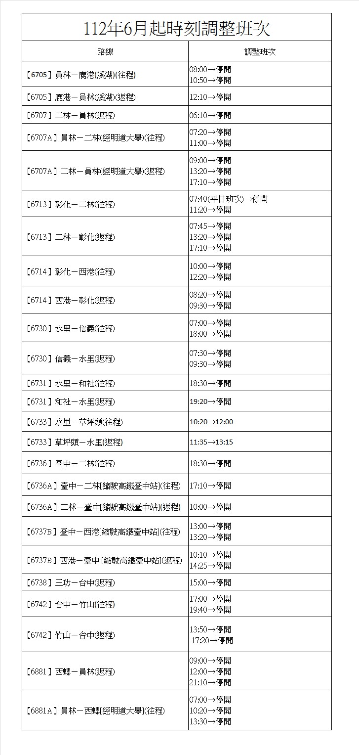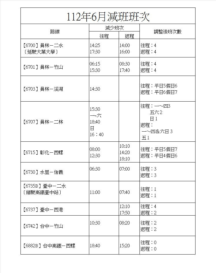 故本公司部分班次將於112/6/1起至112/6/30縮減