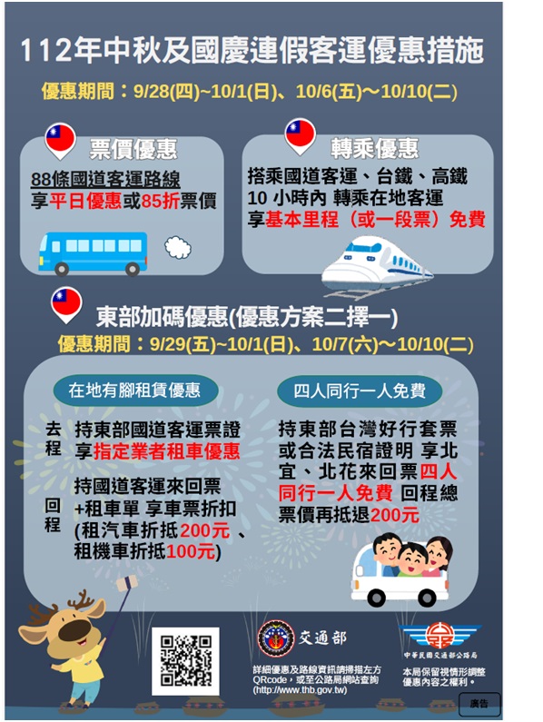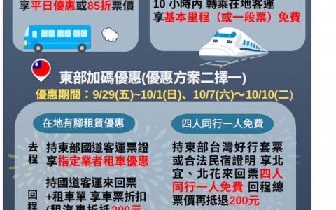 中秋及國慶連假期間為112年9/28~112年10/1、10/6~112年10/10日,搭乘大眾運輸享有雙重優惠!